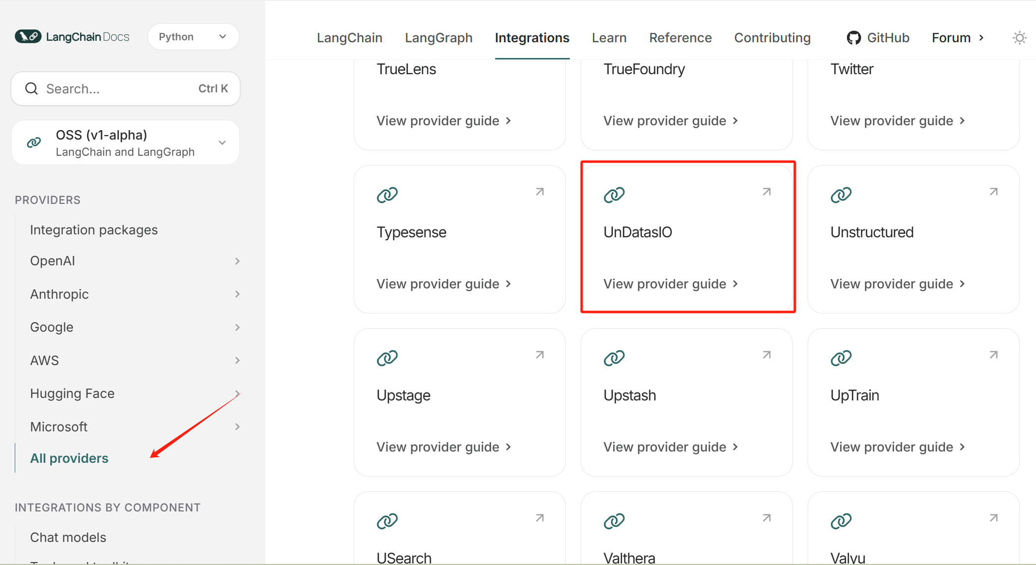 Now, you only need to log in to LangChain website and you can quickly locate UndatasIO in the “All providers” section. As a newly added core provider, we bring robust capabilities to the LangChain ecosystem backed by our technical expertise in the data processing field.